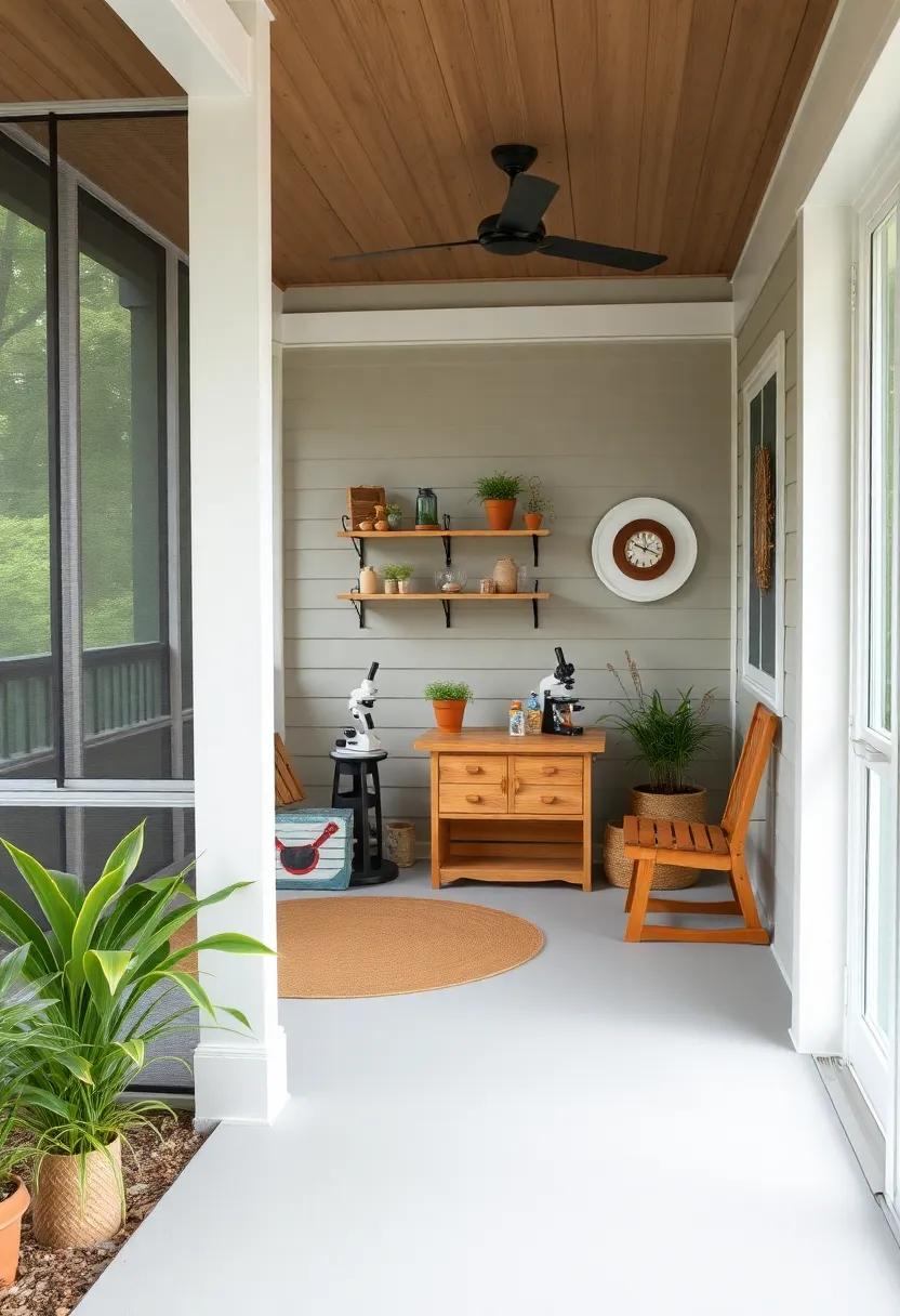 To make the exploration even more engaging, consider incorporating a DIY nature display where children can showcase their journal entries and discoveries. Hang a small wire or string to clip their illustrations or pressed flowers onto, which creates a visual depiction of their findings. By fostering curiosity and observation skills, this mini observation area can become a delightful hub of learning that inspires a lifelong appreciation for the outdoors—all from the comfort of your screened porch.