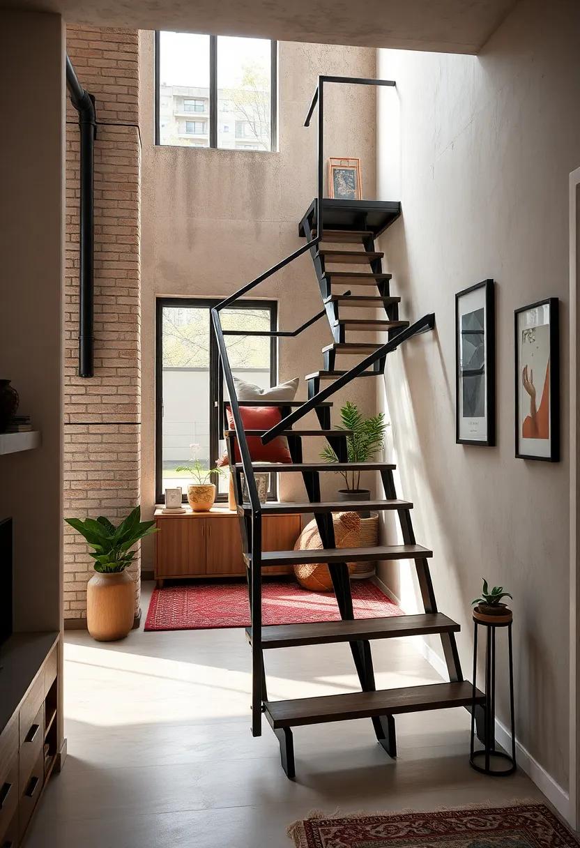Industrial Edge: Dive into a metal staircase with an urban vibe and a foldable handrail, combining style with functionality in a chic city apartment