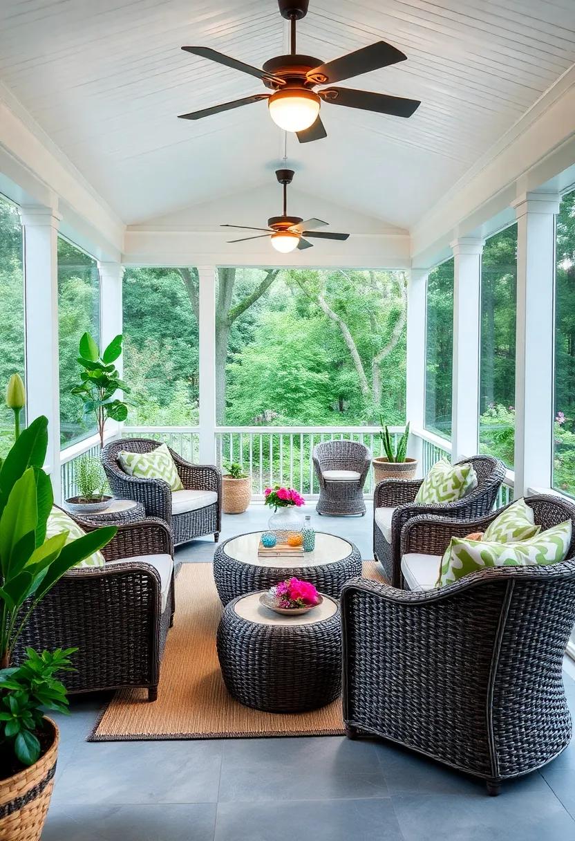 Embrace your creative side by mixing various styles of wicker furniture. Start with different chair designs that can serve as focal points in your screened porch. As an example, pair a rustic, weathered wicker armchair with a sleek, modern wicker lounge chair. This combination not only adds visual interest but also caters to varied seating preferences, making your space functional and inviting. Ottomans can bridge the gap between styles; a traditional woven ottoman alongside a brightly colored pouf can work wonders to enrich the texture and color of your porch.