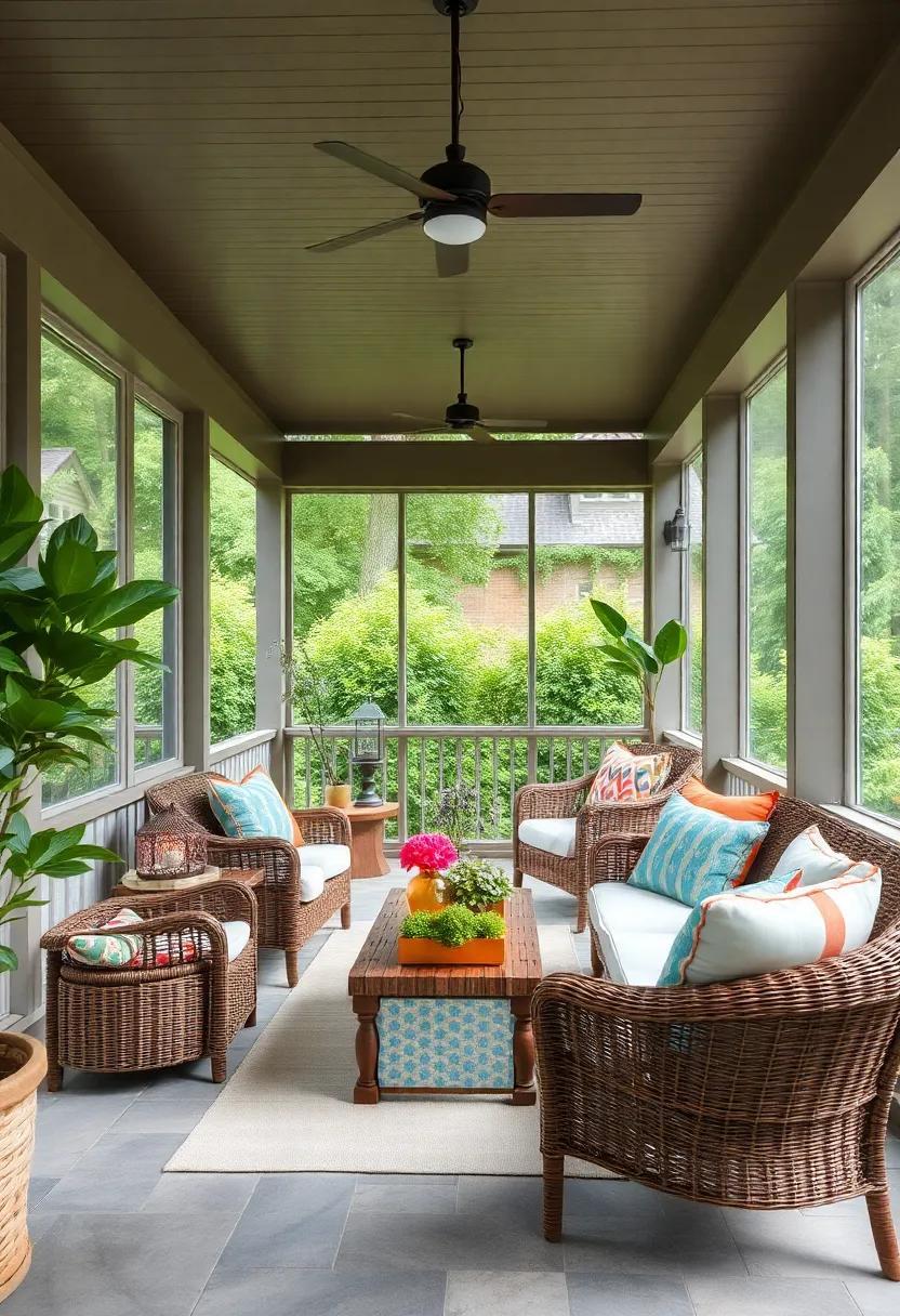 Install a Daybed: Use a large, cushioned wicker daybed as a focal point, perfect for lounging and napping while enjoying the fresh air