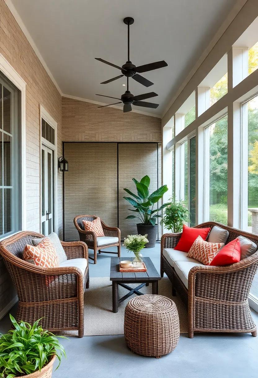 Transform your screened porch into a haven of practicality and aesthetic appeal by incorporating wicker items that are designed with versatility in mind. Consider choosing storage ottomans that not only provide a pleasant seating option but also act as a discreet solution for stashing away blankets, games, or even garden tools. Their woven texture adds to the natural beauty of the space, creating a warm and inviting atmosphere while keeping everything organized. Additionally, these chic pieces can easily blend with your existing decor, enhancing the overall look of your porch.
