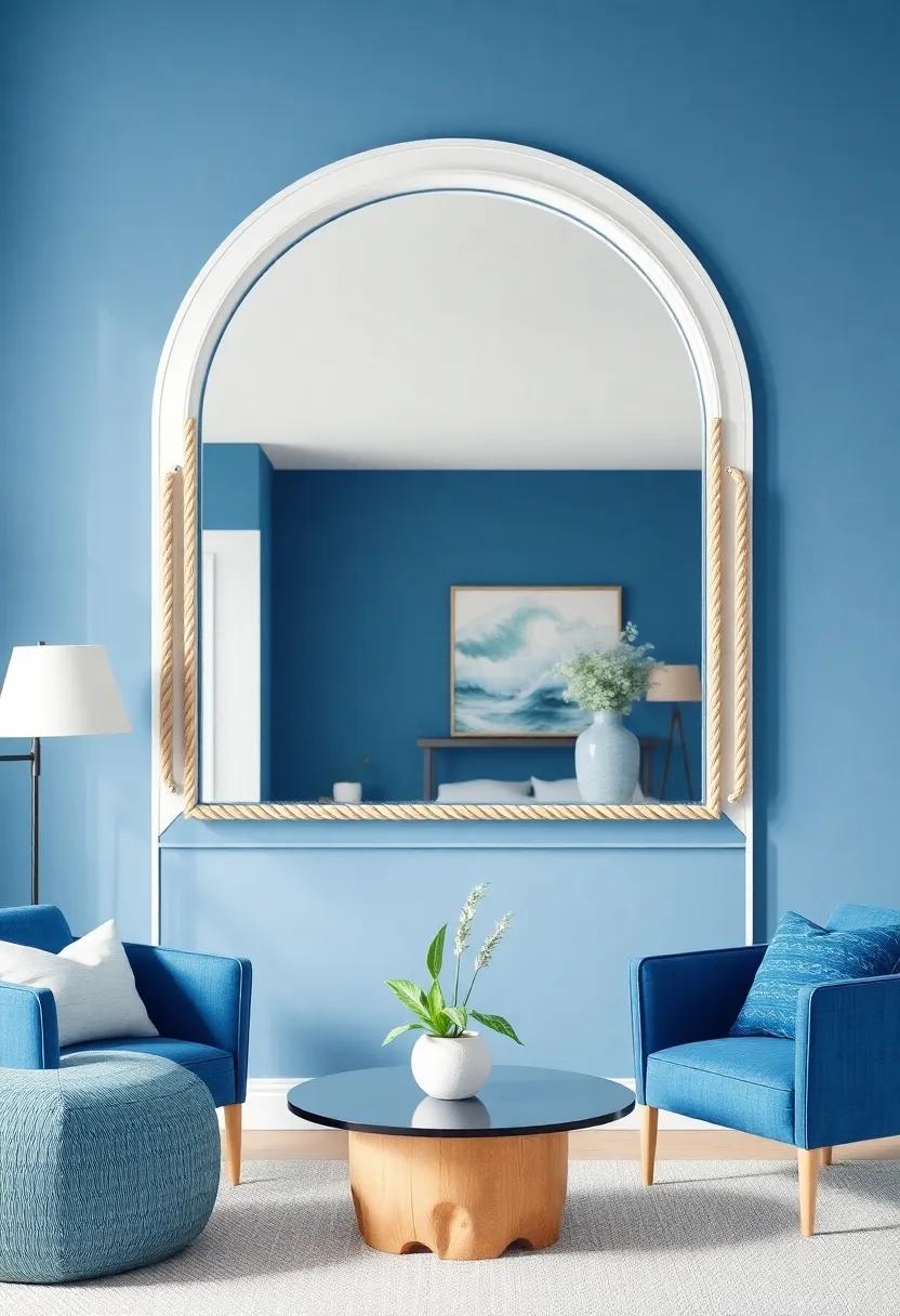 Imagine a spacious room filled with natural light, where the gentle hues of the ocean are mirrored back to you from beautifully crafted wall decor. Using nautical rope to encircle your mirrors not only adds a textural element but also an ocean-inspired charm that seamlessly blends with your coastal decor. The rugged, timeless appeal of rope is reminiscent of maritime adventures, turning a simple reflective surface into a statement piece that celebrates the sea. Hanging these mirrors at varying heights can emphasize the illusion of greater space, creating a tranquil atmosphere that invites relaxation, much like the calm waves of the shore.