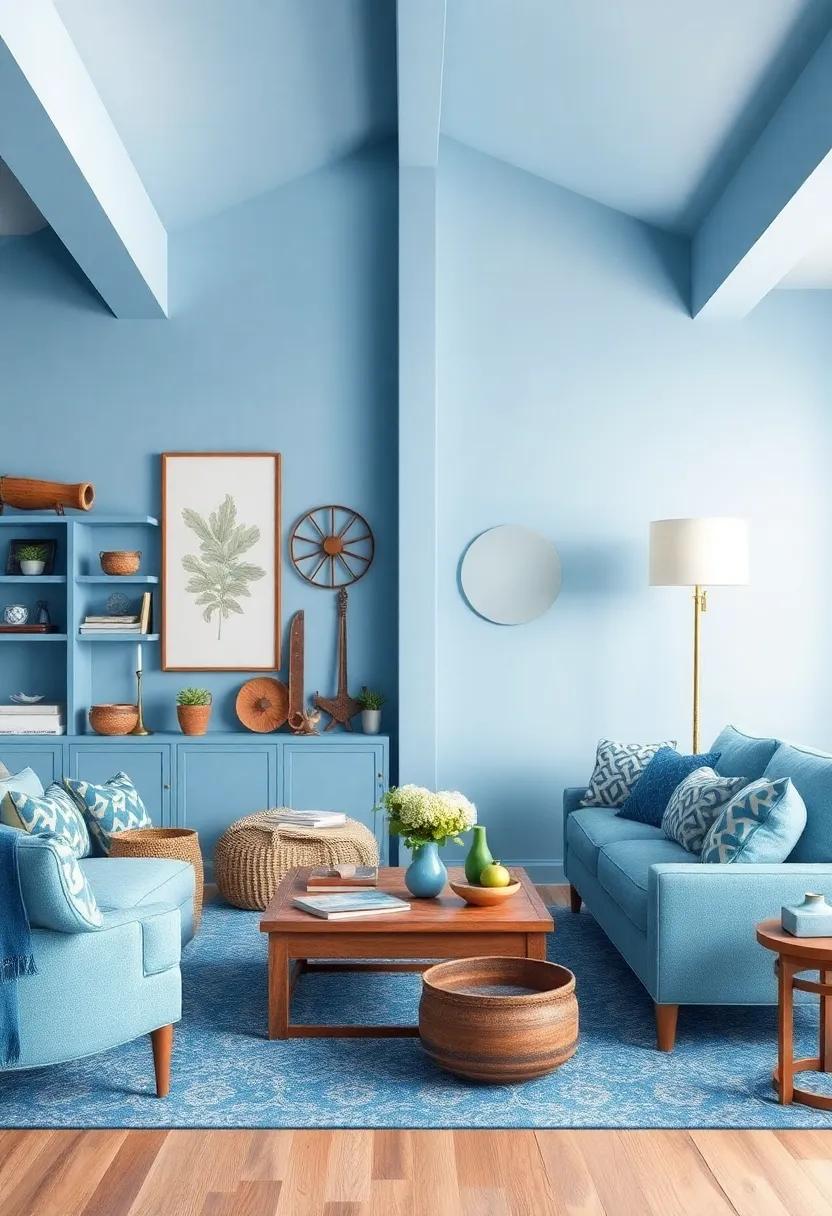 To elevate the serene ambiance of your blue living room, consider integrating metal accents that echo the soft luster found in coastal environments. Pieces crafted from brass or silver can capture the shimmering essence of wet sand and seashells, adding a refined touch to the decor. Imagine elegant brass candle holders that cast warm, flickering reflections, or a stunning silver-framed mirror that not only enhances light but also amplifies the spacious feel of the room. Incorporate sculptural metallic elements, like a handcrafted brass coral sculpture or an abstract silver art piece, to serve as striking focal points that resonate with the natural beauty of the sea.