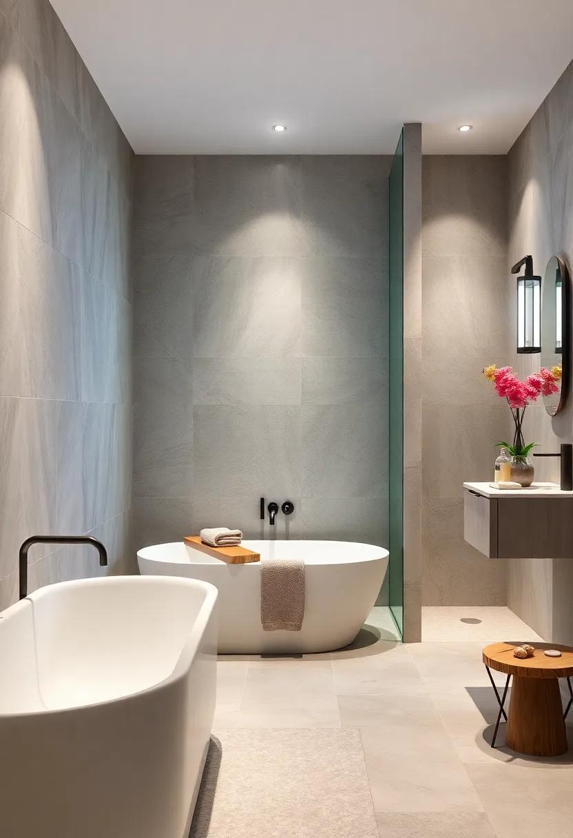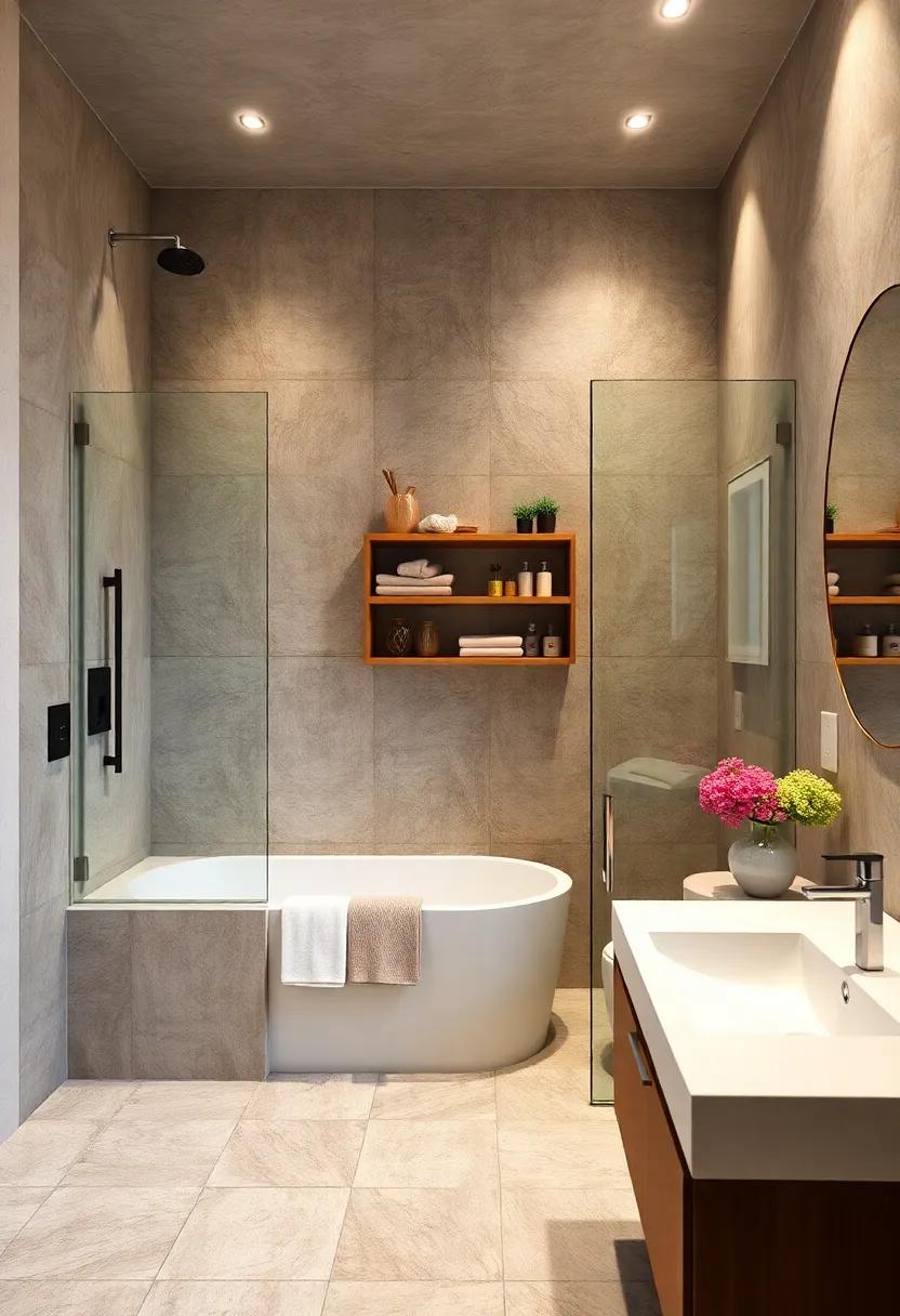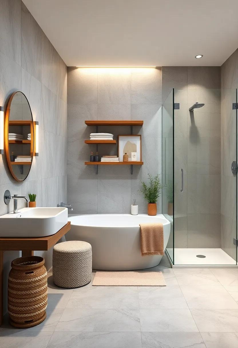 By carefully combining these materials, you can create a cohesive look that celebrates the beauty of nature while providing practical functionality. Attention to detail, like choosing the right finish for wooden elements to withstand moisture, ensures longevity and enhances the harmony within the space. The interplay between stone and wood fosters a balanced environment, inviting you to unwind and rejuvenate with every bath or shower experience.