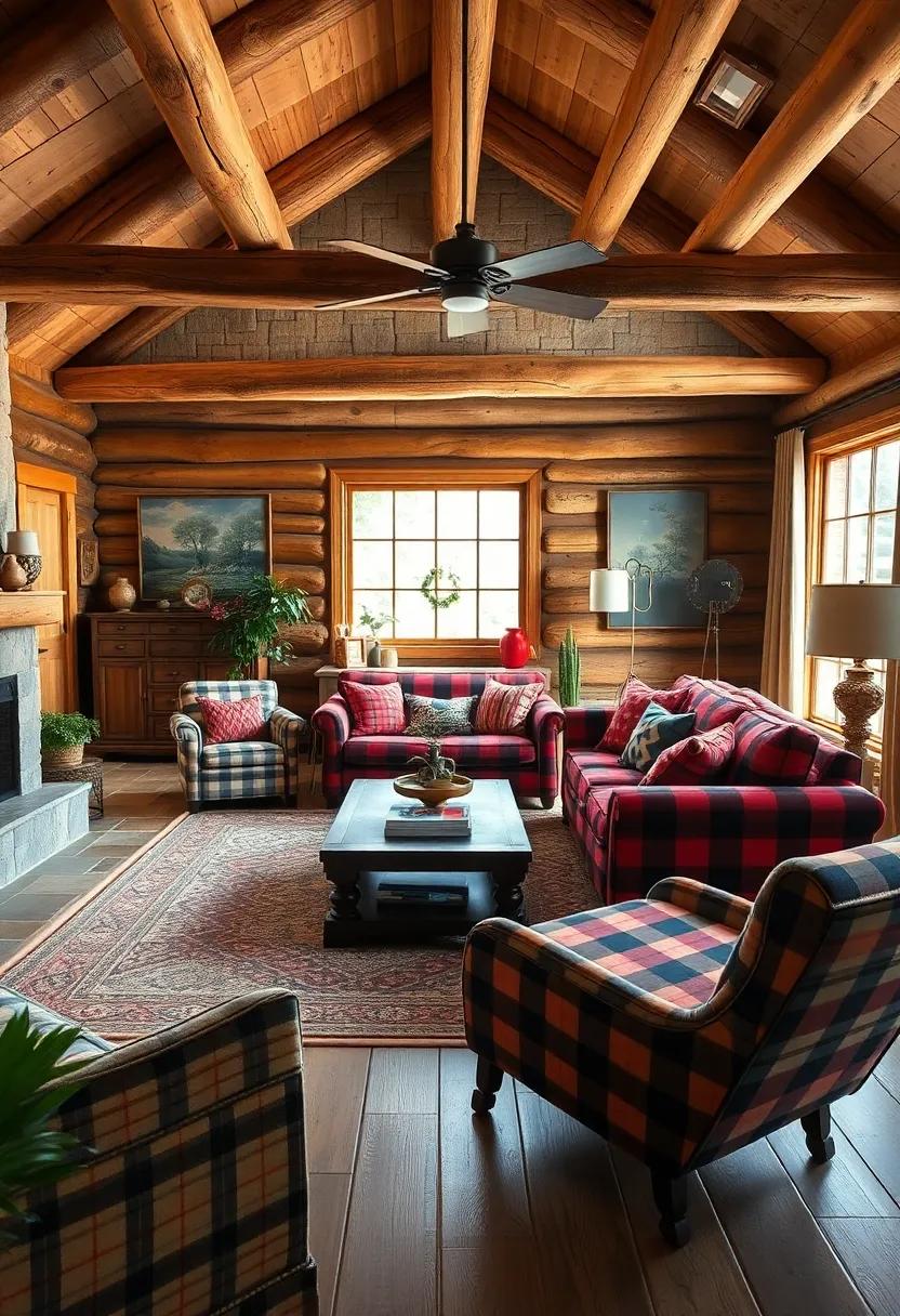 Experience the cozy charm of a log cabin-inspired living room, where vintage plaid fabrics and antique wood furnishings create a rustic yet stylish retreat