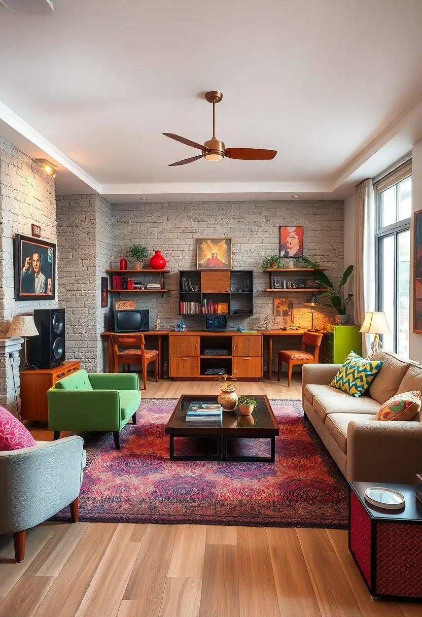 Funky lighting fixtures play a pivotal role in setting the mood and character of the space. Hanging macramé lamps and retro pendant lights infuse the room with a delightful blend of trendiness and whimsy, casting soft, diffused light throughout. for a touch of authenticity, don’t shy away from incorporating groovy accessories, such as vintage art prints or vibrant throw pillows that feature floral patterns. Arrange your eclectic furniture—a low-slung couch and a bubble chair—to create an inviting layout that encourages interactions. This combination not only encapsulates the spirit of the ’70s but also showcases how retro aesthetics can inject life and personality into modern homes.