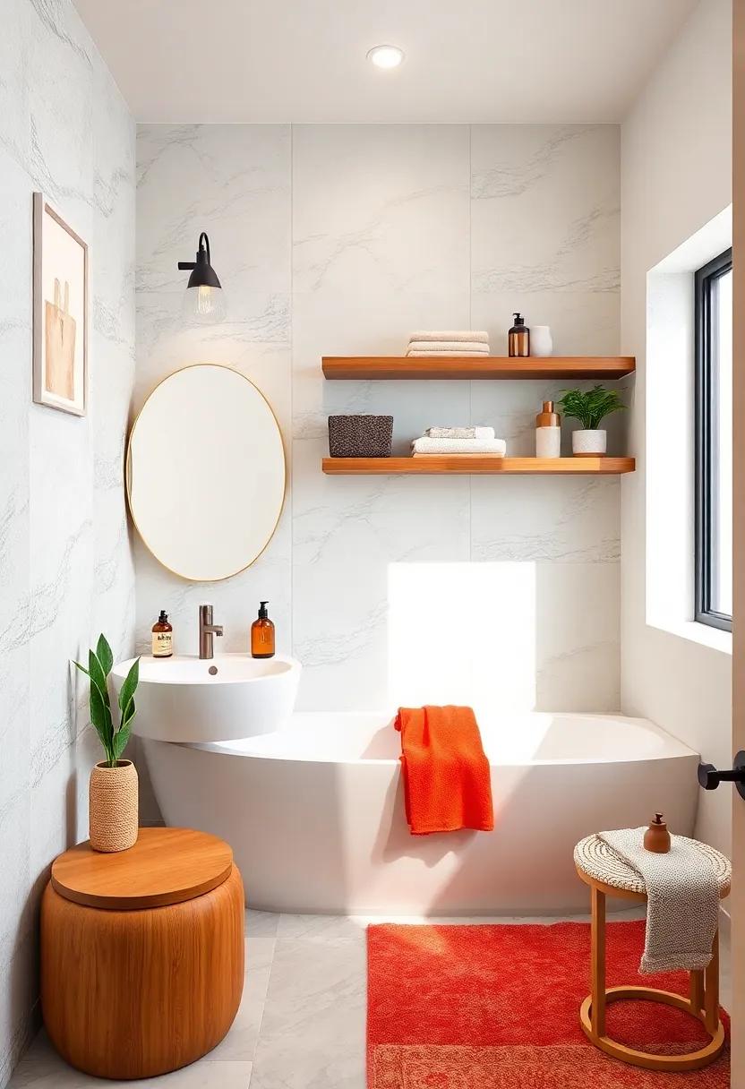 Introduce Natural Elements: incorporate natural materials like bamboo or wicker to add warmth. A bamboo bath mat or wicker baskets can elevate the space and provide functional storage
