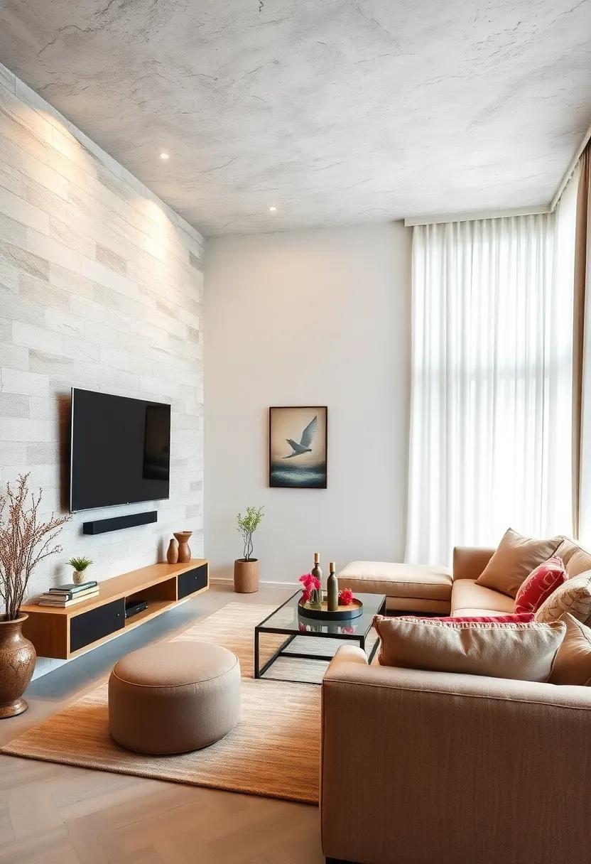 Transform your small living room into a cozy retreat by introducing textured wall treatments that elevate the aesthetics and introduce warmth. Consider wood paneling for its rustic charm or stone accents to create a trendy, natural ambiance. These materials not only serve as a stunning backdrop for your wall-mounted TV, but they also add visual interest that breaks the monotony of flat surfaces. Imagine a striking reclaimed wood wall that adds a touch of farmhouse elegance or a sleek stone feature that draws the eye upwards, enhancing the perception of height in your room.