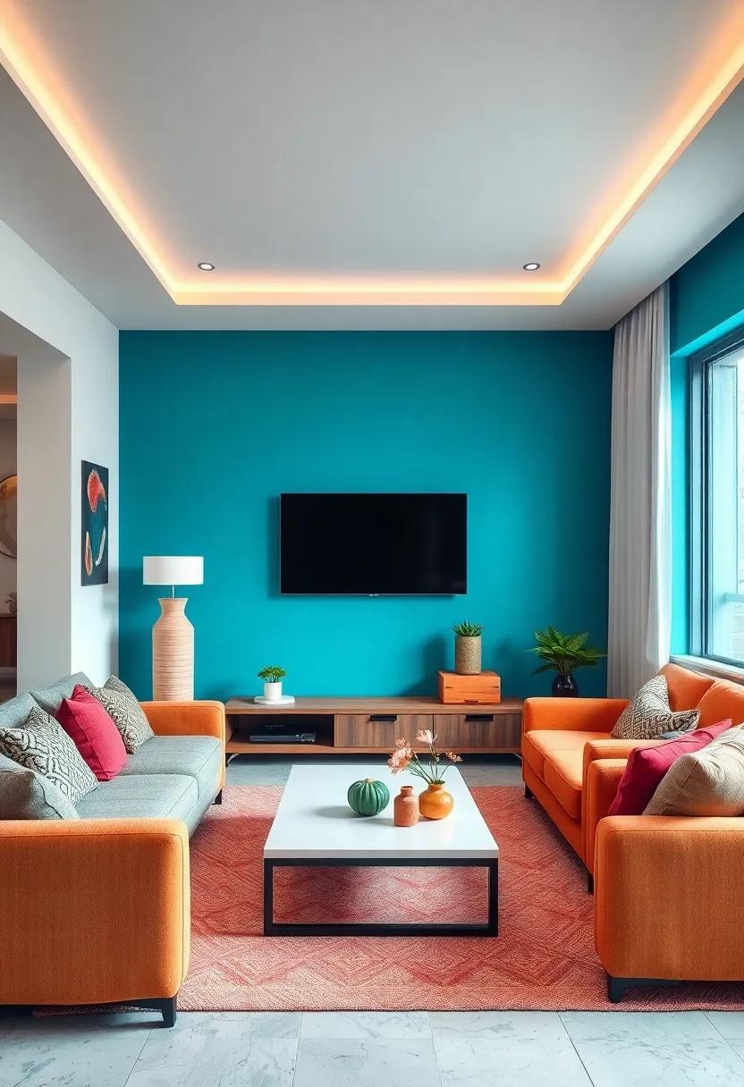 Color Coordination: Paint the wall behind your TV in a bold color that complements the rest of your living room, allowing your wall-mounted setup to become a striking feature