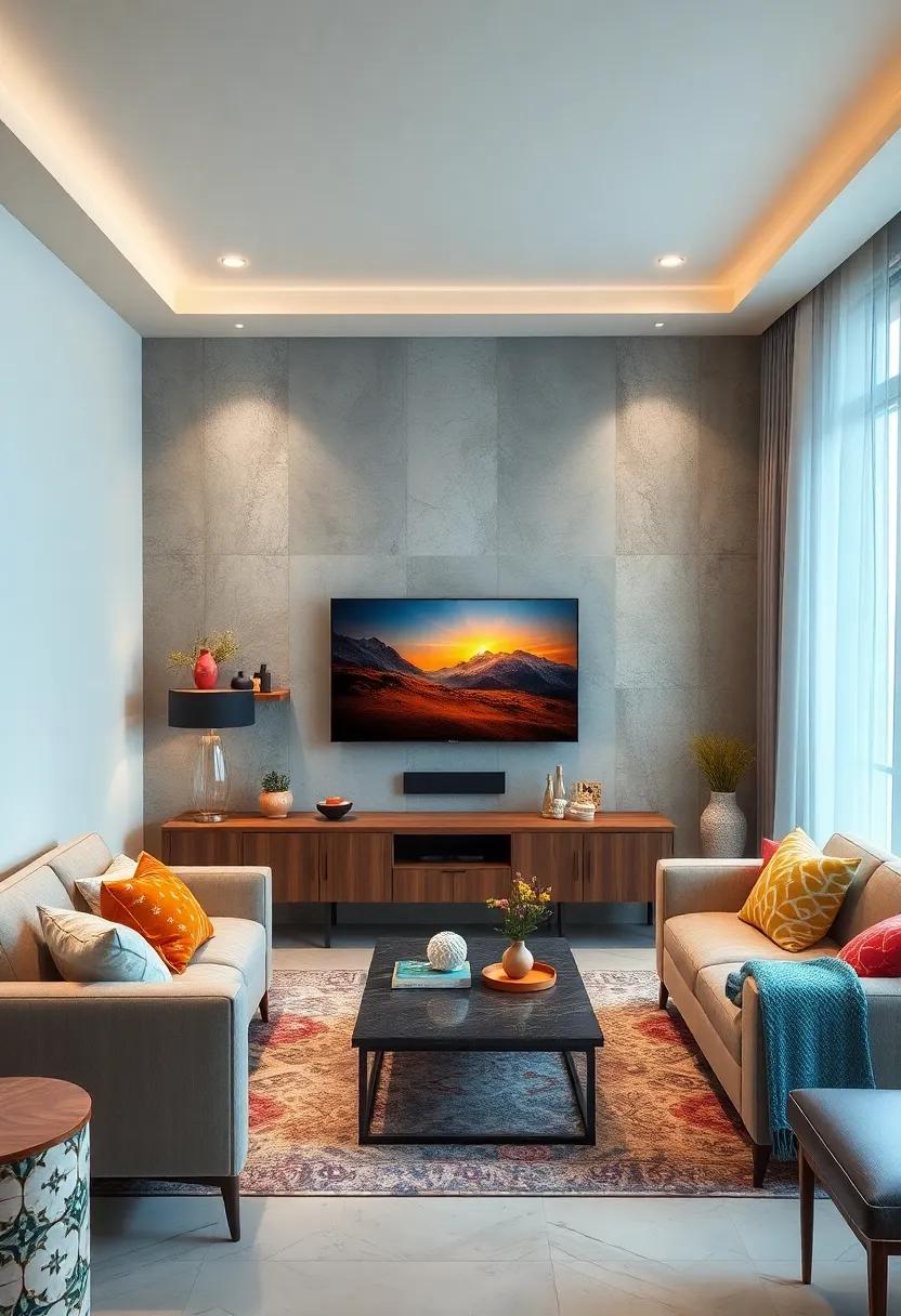Infusing your living room with bursts of color can transform a neutral backdrop into a vibrant oasis. Artfully arranging decorative accents around a wall-mounted TV not only draws the eye but also elevates the entire space. Consider an eclectic mix of framed artworks and prints with varying hues to create visual interest. Incorporate accents like brightly colored vases or decorative bowls on nearby shelves or tables to complement the theme without distraction. Balancing these elements seamlessly fosters a lively yet organized look.