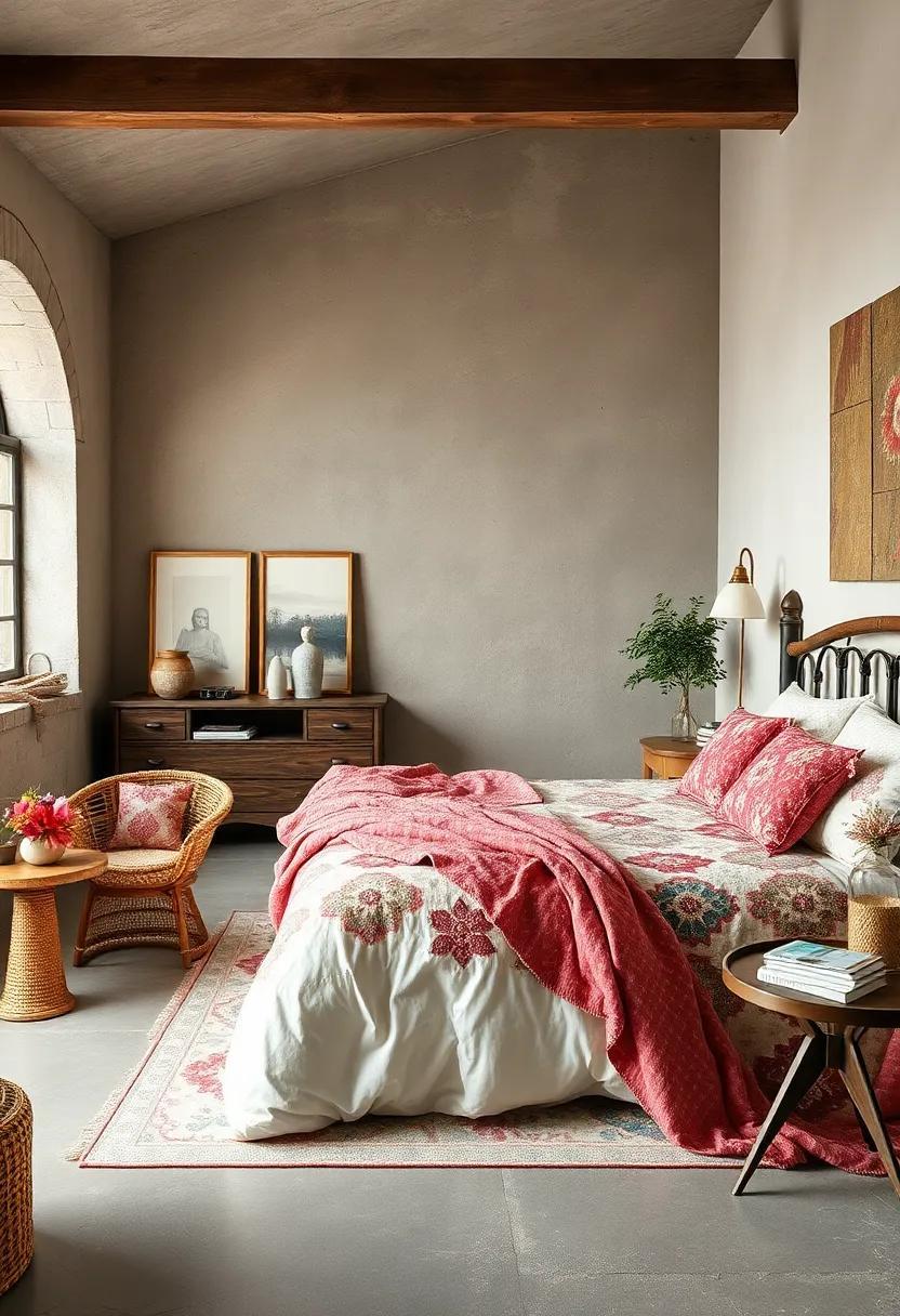 The ambiance of this bedroom invites you to indulge in moments of stillness, with the sun’s rays coaxing you to linger just a bit longer. Here, you’ll find unique details that cultivate a warm atmosphere, like handcrafted wooden shelves adorned with vintage books and trinkets collected over the years. A plush armchair, cloaked in a soft knit throw, occupies a sunlit corner curated for reading and reflection. The natural textures of wicker baskets and clay pots harmonize with the soft patterns of the surrounding quilts, crafting a tableau that is both timeless and inviting. This is a space where the heart can pause, and every element brings you closer to the simple joys of life.