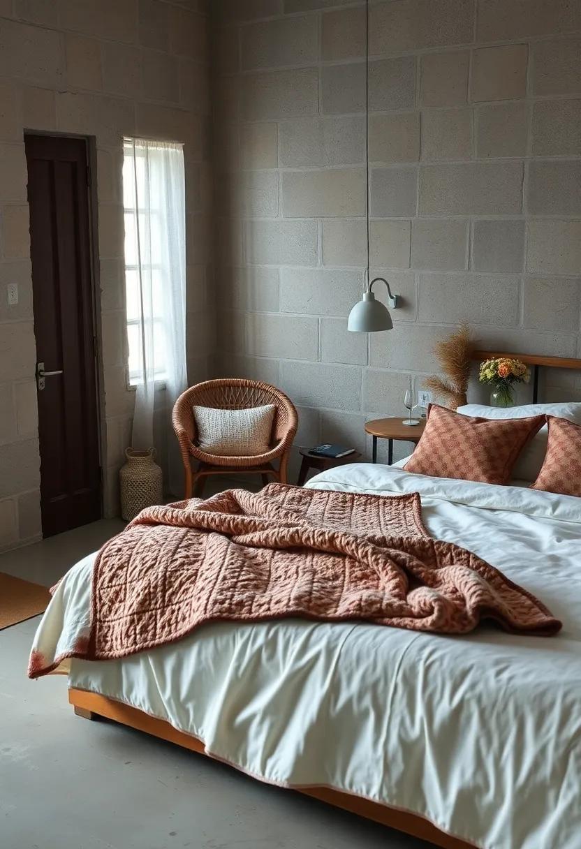 Think of a rustic cottage bedroom exuding charm with exposed brick walls,lovingly paired with a quilt showcasing a countryside motif
