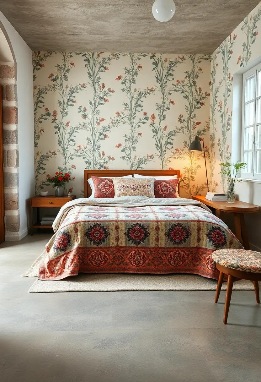 Discover a small, yet cozy bedroom where a vintage quilt is prominently displayed against a backdrop of botanical wallpaper, creating a breath of fresh air