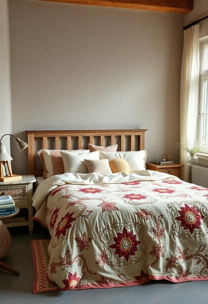 Warm wooden furniture combined with a striking quilt featuring intricate embroidery makes for a perfect retreat in any cottagecore sanctuary