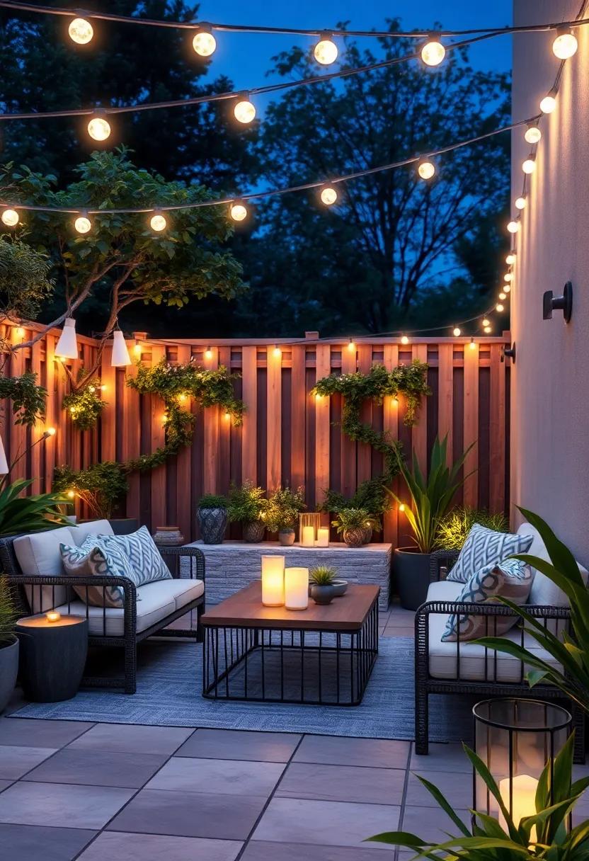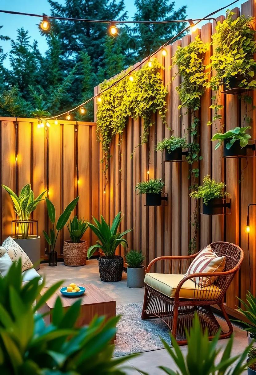 Vertical Vines: Harness vertical space by growing wall-mounted planter boxes along the fence and pairing them with string lights to enhance visual interest and ambiance