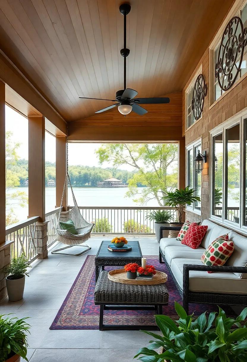The layout invites creativity, allowing you to arrange the hammocks and cushions in a way that speaks to your personal style. Perhaps you’d opt for a circular seating arrangement, encircling a low coffee table draped with lush greenery or rustic decorations.add strings of soft fairy lights overhead to illuminate magical evenings where laughter and relaxation linger in the air long after the sun sets. The optimal design infuses tranquility into your space, making the screened porch the ultimate escape for all seasons.