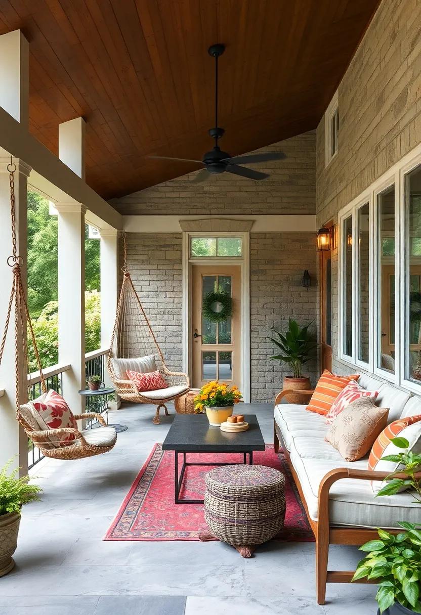 Suspended in the air are bamboo swings and hammocks made from organic fibers, perfect for lounging in comfort. The gentle sway of these eco-friendly seating options invites a restful moment with a book or simply enjoying the soft sounds of nature. Each swing is crafted to support both relaxation and an eco-conscious lifestyle, offering a unique experience that harmonizes with the environment. Combining natural materials with thoughtful designs, this porch serves as a reminder that luxury and sustainability can coexist beautifully, providing the ultimate sanctuary for anyone seeking a mindful retreat.