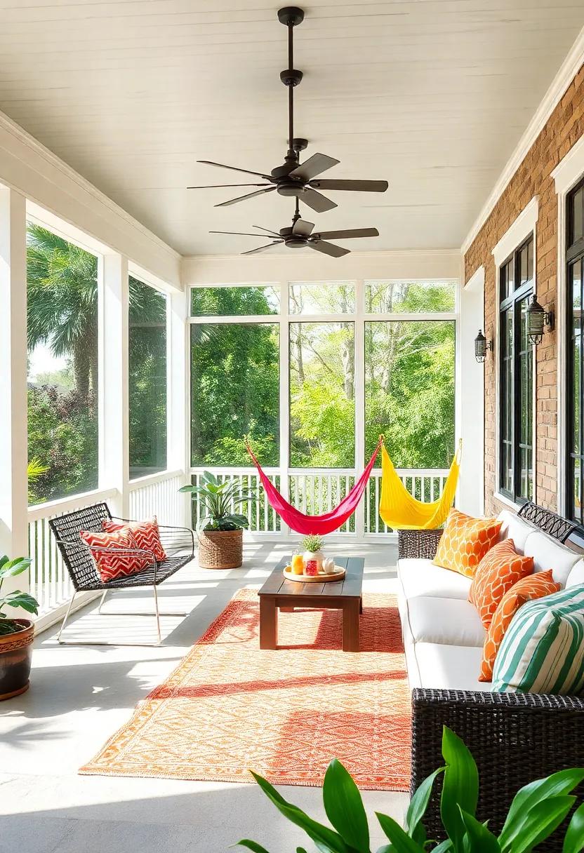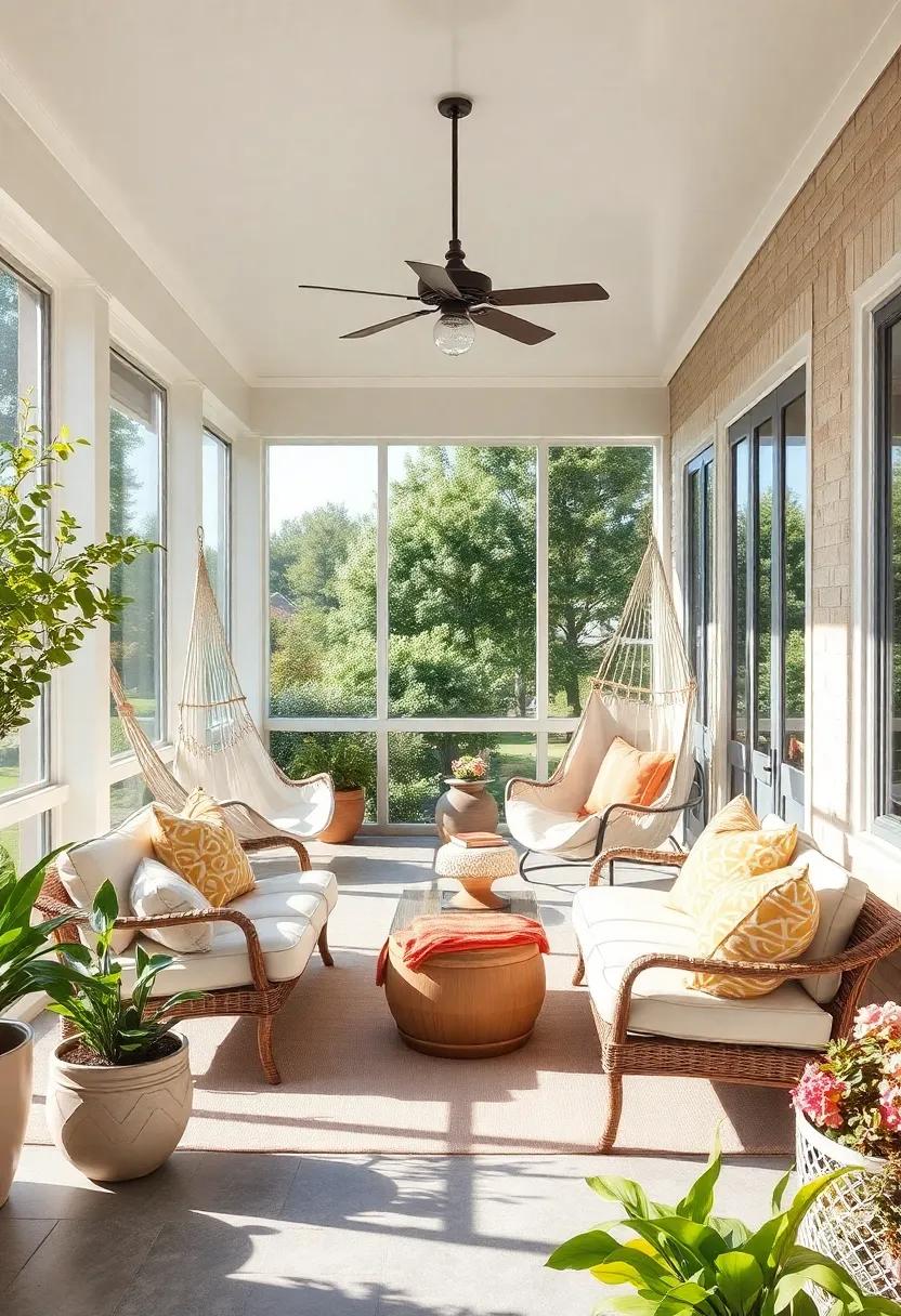 Artistic Haven: This eclectic screened porch combines art and relaxation, featuring unique hammock designs and swings that inspire creativity while you soak in the beauty of your garden view