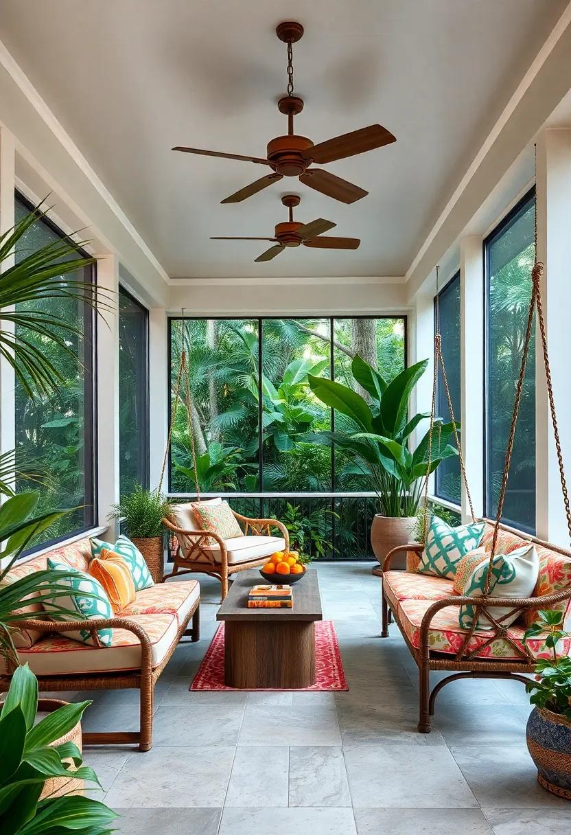 Tropical Hideaway: With bamboo décor and bright patterned textiles,this screened porch transports you straight to a paradise retreat,featuring cushioned swings that sway with the island breeze