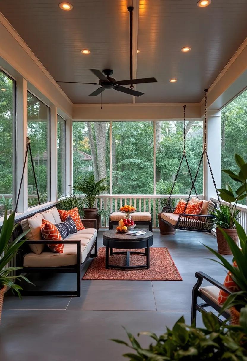 Urban Oasis: Nestled in the heart of the city, this modern screened porch provides a cozy pocket of greenery, with sleek metal swings and vibrant potted plants that create a refreshing escape from urban hustle