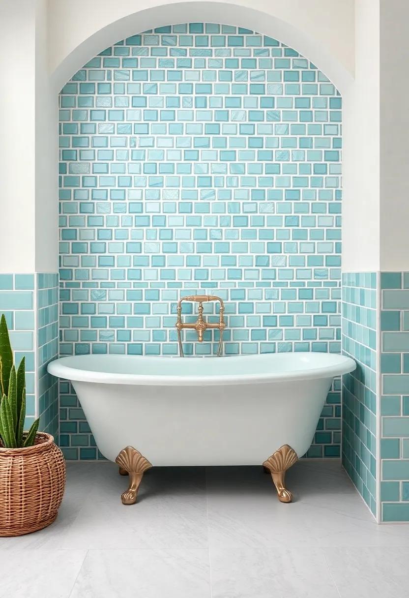 Discover the beauty of a tiled alcove featuring a turquoise clawfoot tub, paired with sea-glass colors and natural textures that evoke a laid-back coastal vibe