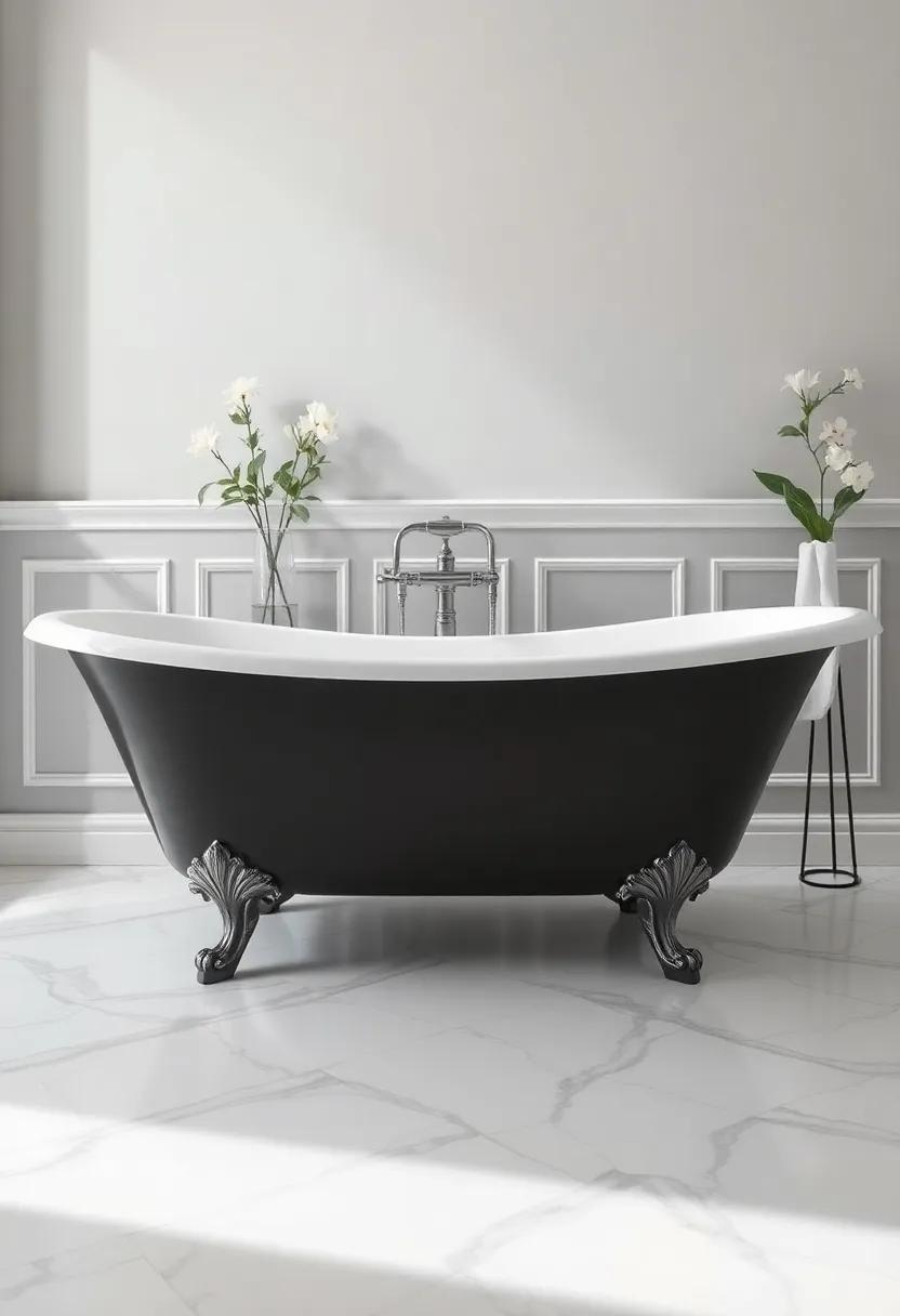 Dive into the depths of elegance with a charcoal gray clawfoot tub, highlighted by classic white trim and delicate floral accents that bring the perfect touch of detail