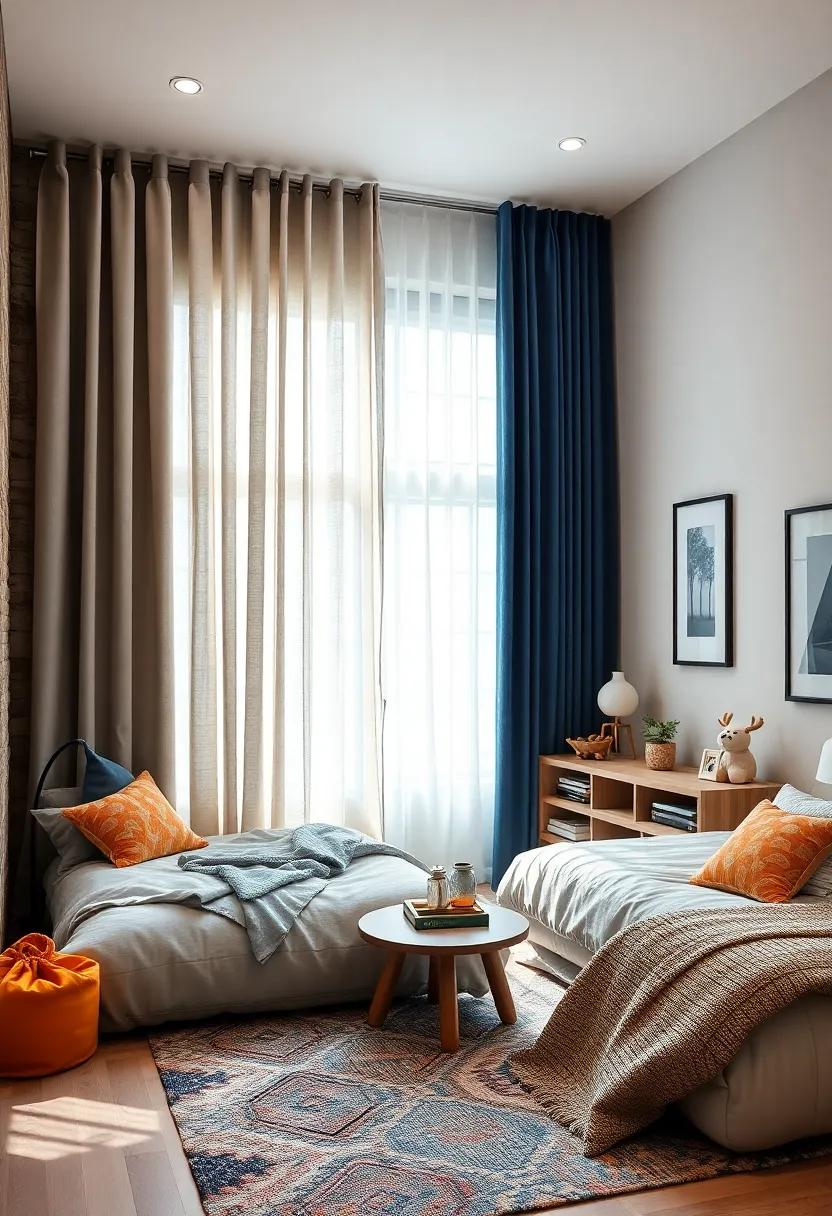 Transforming a single room into multifunctional spaces is both an art and a strategy in modern design. Curtain dividers allow you to craft distinct zones within a limited area, creating a playful yet practical environment. With the right fabric and colors, you can easily differentiate between a vibrant play zone and a serene sleeping area. For exmaple, consider using bold patterns for the play zone curtains to ignite creativity and energy, while opting for softer hues in the sleeping area to promote relaxation and rest. This approach not only maximizes functionality but also adds a dynamic visual element to the room.