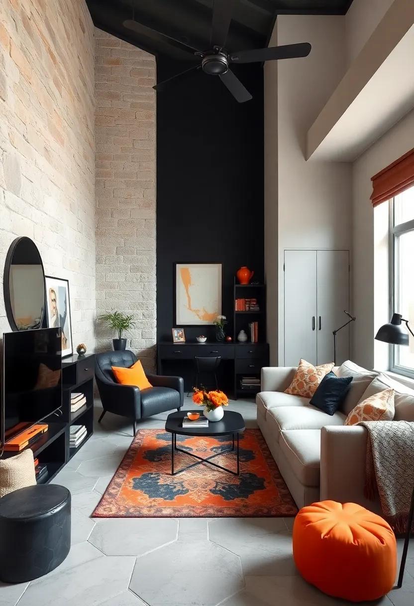 Textured Rugs: Incorporate a plush black rug to soften the space and create a cozy atmosphere, layering in pops of tangerine through smaller accent rugs
