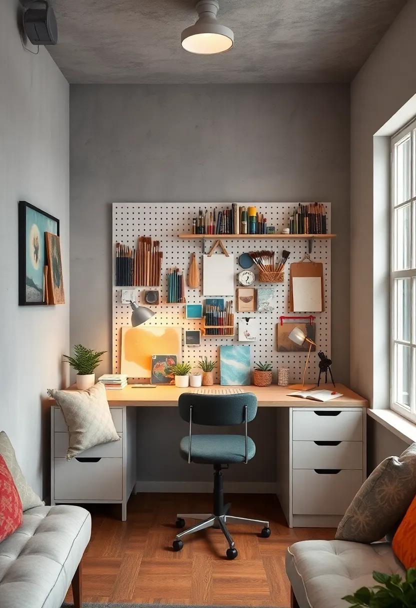 Artistic Influence: Explore a small office inspired by visual arts, where a pegboard holds inspiring quotes and artworks, transforming the workspace into a source of motivation