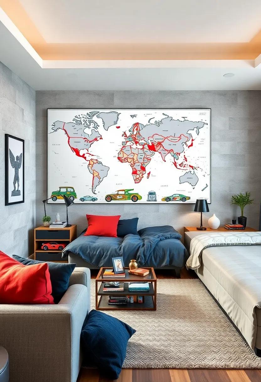 Transform the walls of a racing-themed room by hanging a world map that features iconic racetracks from around the globe. This visually stunning centerpiece not only ignites a sense of adventure but also fuels aspirations to race in far-off locations. Use brightly colored pushpins to mark each racetrack visited, creating a dynamic visual representation of accomplishments and dreams. embellish the map with fun racing stickers or small flags that represent countries where the tracks are located, turning the space into a personalized gallery of speed.
