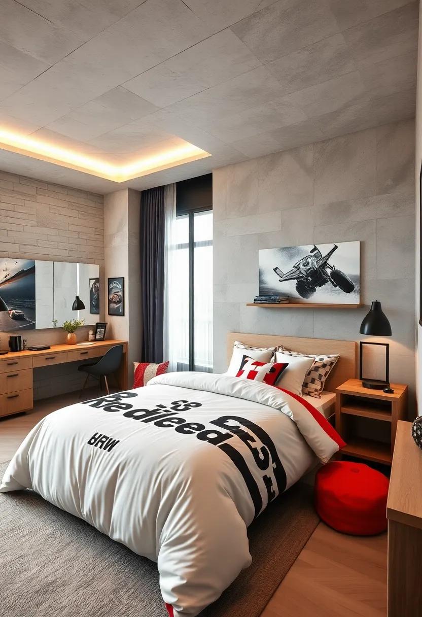 Transforming a teen’s room into a racing sanctuary is about more than just flashy furniture and vibrant colors; it’s also about creating an immersive experience. Wall decals of legendary racing cars like the Ferrari F40 or the classic Porsche 911 can transport the room into a high-speed world. These decals not only add striking visuals, but they also serve as great conversation starters. Choose decals that feature dynamic angles or are emblazoned with race numbers to create a sense of motion and excitement. The use of checkered flag patterns as a backdrop or accent piece can create a fresh look that complements your racer theme, enhancing the adrenaline of any space.