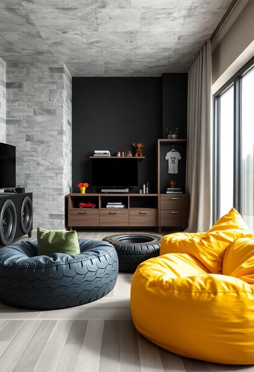 Use tire-themed bean bags or floor cushions for comfortable seating that mirrors a racing pit stop