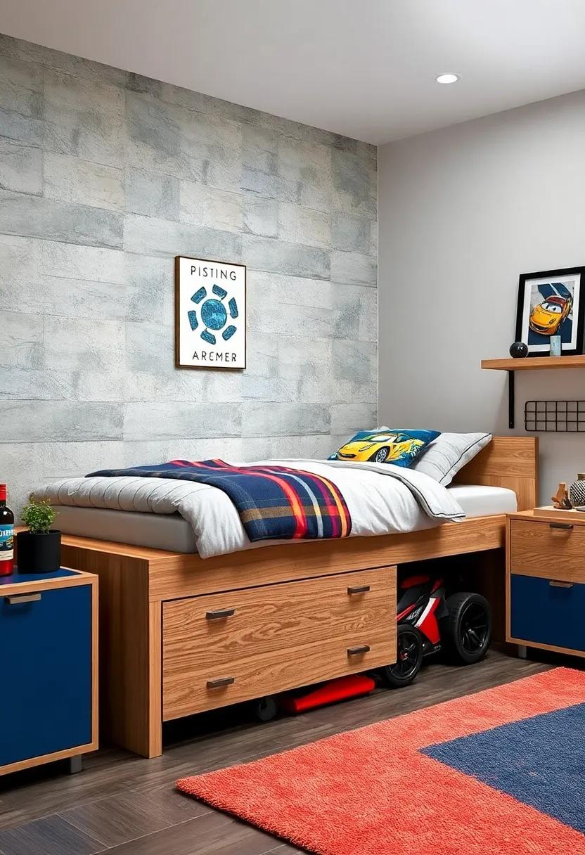 Transforming the often-forgotten space beneath your teen’s bed into a mini garage can offer a thrilling solution for organizing racing gear and toys. Utilizing under-bed storage containers resembling a garage not only keeps items tidy but also aligns perfectly with the high-octane theme of the room. Opt for sleek, rolling storage bins that can easily slide in and out, making it convenient to grab gear before race day.