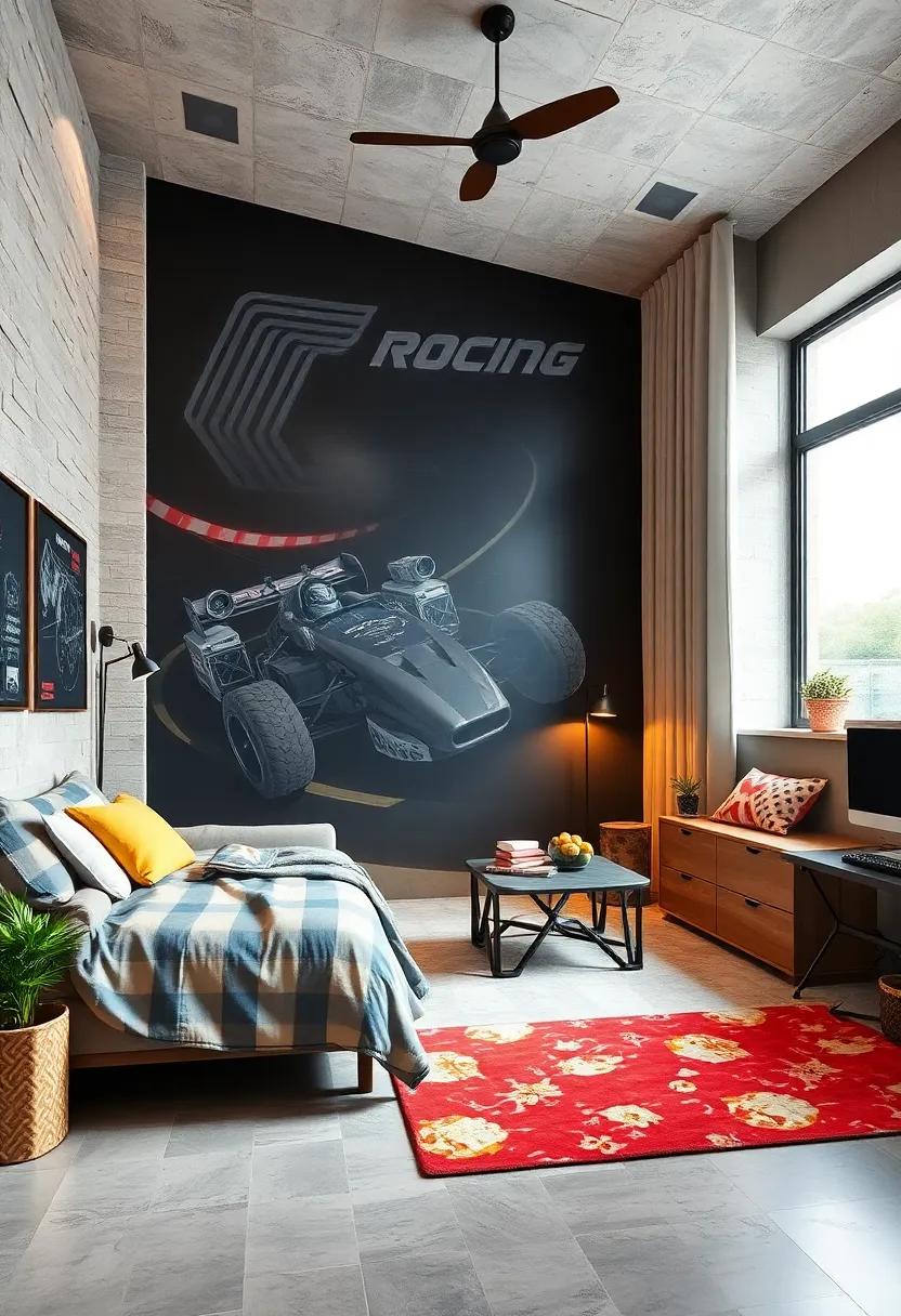 Transform your teen’s space into a thrilling pit stop with a racing-inspired mural that takes center stage. Consider a dramatic drag race scene, showcasing sizzling cars in mid-action, complete with vibrant colors and dynamic motion lines that suggest speed and excitement. Alternatively, a stunning scenic track mural, winding through verdant landscapes or urban environments, can create an immersive backdrop that captures the essence of adrenaline-fueled racing moments. When painted or wallpapered on a prominent wall, these murals can instantly elevate the aesthetic of the room, serving as a conversation starter and an inspiring daily visual.