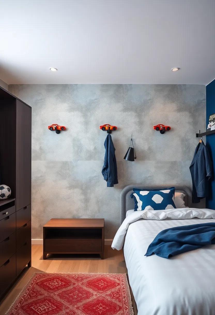 To truly immerse your teen’s space in a racing atmosphere, car-shaped wall hooks offer a fun and functional solution. These eye-catching hooks not only serve a purpose but also act as striking decor pieces that echo the adrenaline of the racetrack.Imagine sleek race cars in vibrant hues, each cleverly designed to hold everything from jackets to hats. By integrating these hooks into the room, you can make organizing clothes and accessories feel like an adventure, enhancing the room’s overall theme while keeping it tidy.
