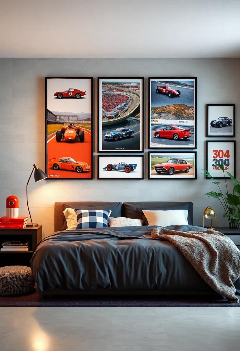 Design a gallery wall with framed posters of iconic races, drivers, and vintage cars for inspiration