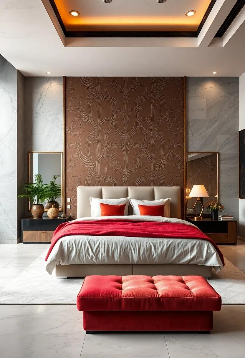 Textural Delight: The feature wall in this bedroom showcases a quilted design in rich burgundy, adding depth and warmth to the luxurious aesthetic