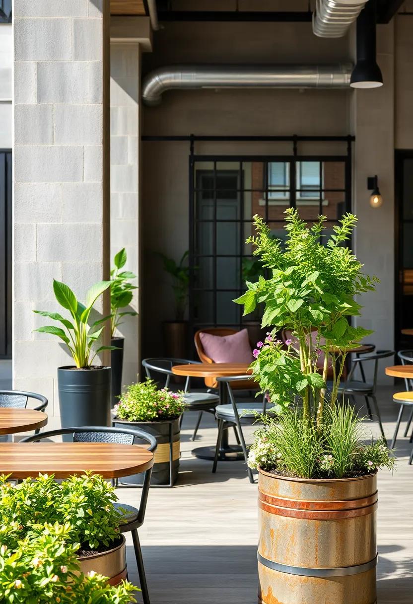 This thoughtful combination of metal planters and greenery not only enhances the dining experience but also showcases a trend that merges culinary delights with nature’s beauty, capturing the essence of outdoor industrial dining.