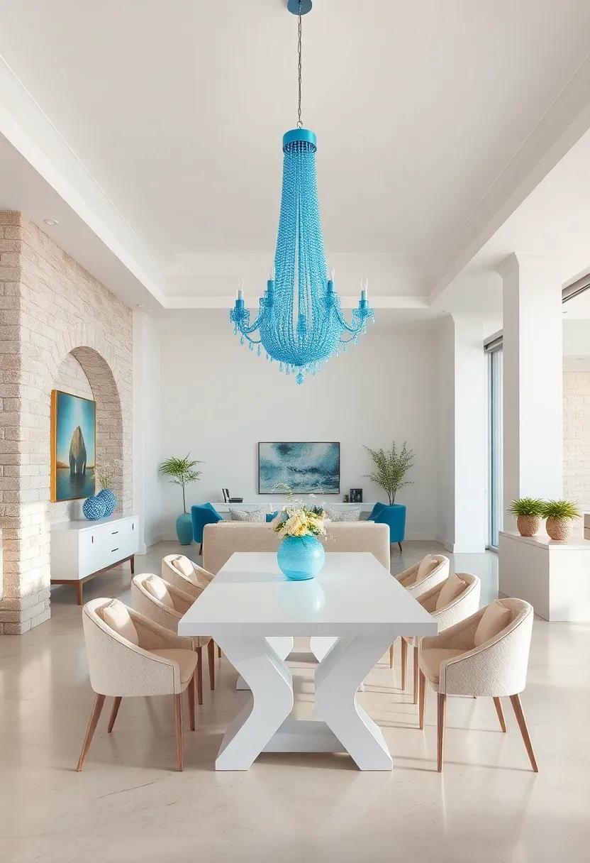 In this luxurious beach house, a statement blue chandelier hangs gracefully over a pristine white dining table, uniting the space with a focal point that feels both sophisticated and inviting