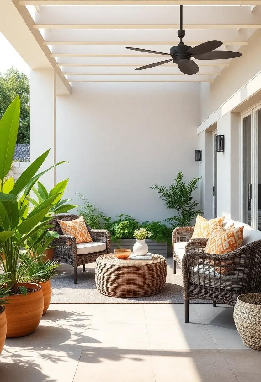 Stylish Rattan Retreat: Explore the natural warmth of rattan furniture paired with vibrant cushions, perfect for lounging in a sun-soaked patio setting