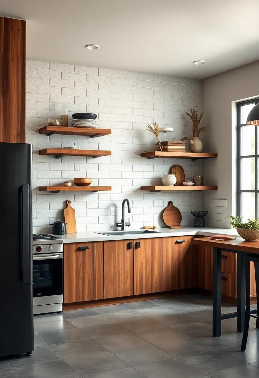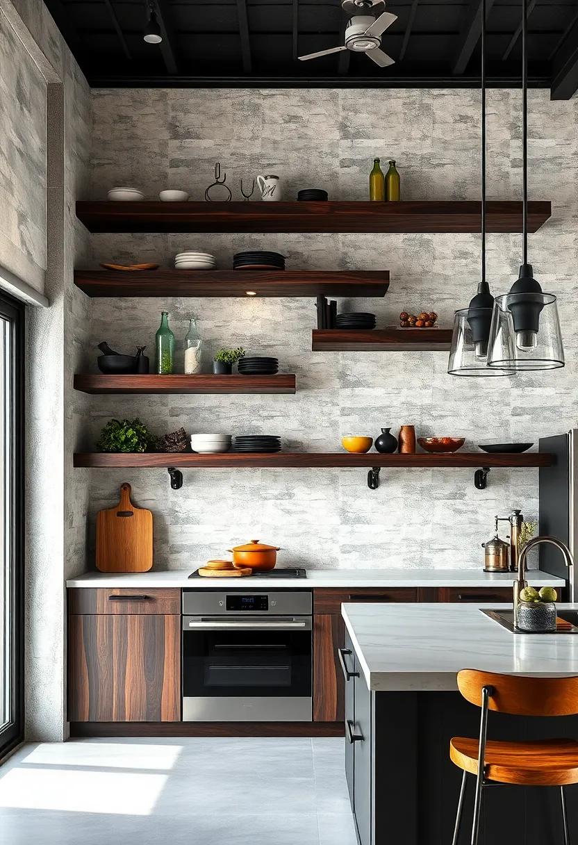 Industrial Chic: Combine rustic charm with modern aesthetics by opting for floating shelves with metal brackets, perfect for displaying your favorite cookbooks and culinary tools