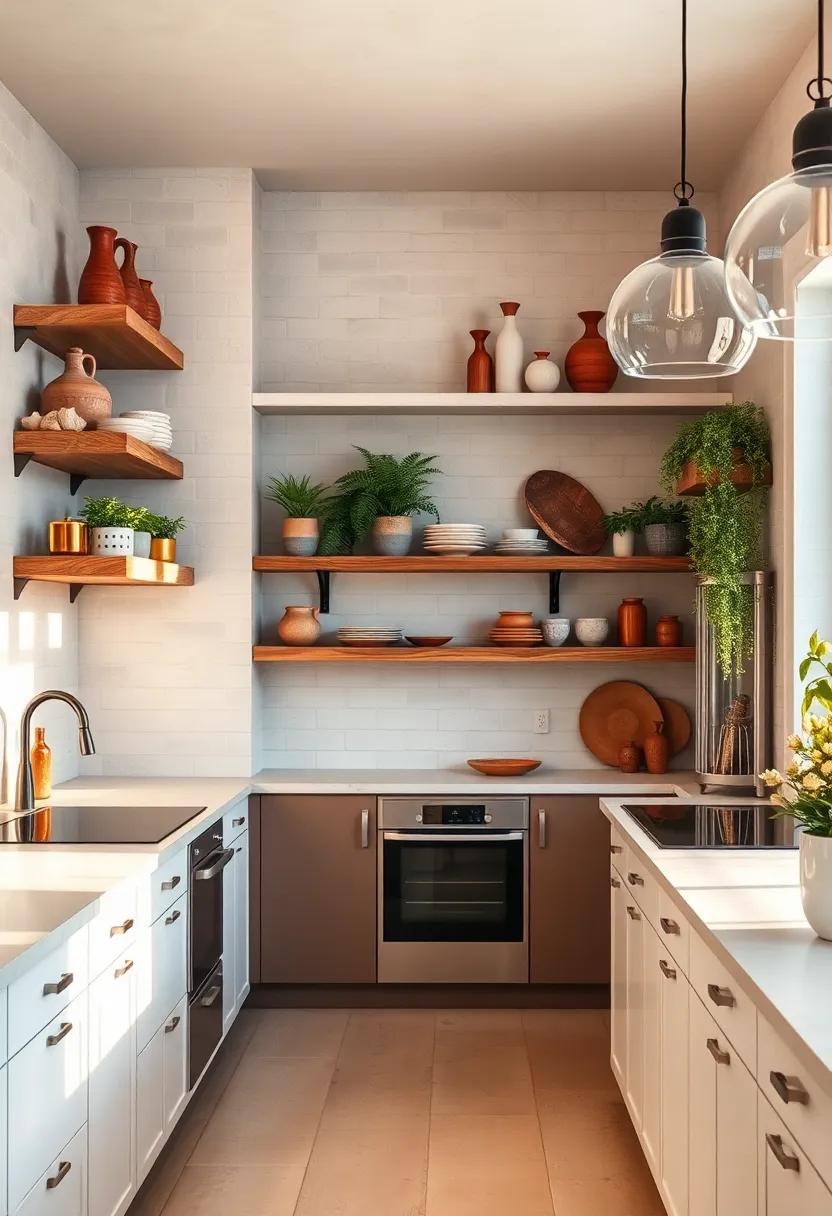 Elevate your kitchen by incorporating floating shelves that seamlessly blend rustic charm with modern design elements. These shelves, featuring robust metal brackets, provide an eye-catching display for your cherished cookbooks and culinary tools. Choose wooden shelves with natural finishes to introduce warmth and texture, creating a perfect backdrop for sleek, metallic brackets that add an industrial edge. This harmonious combination not only maximizes vertical space but also creates an inviting atmosphere where your culinary creativity can flourish.