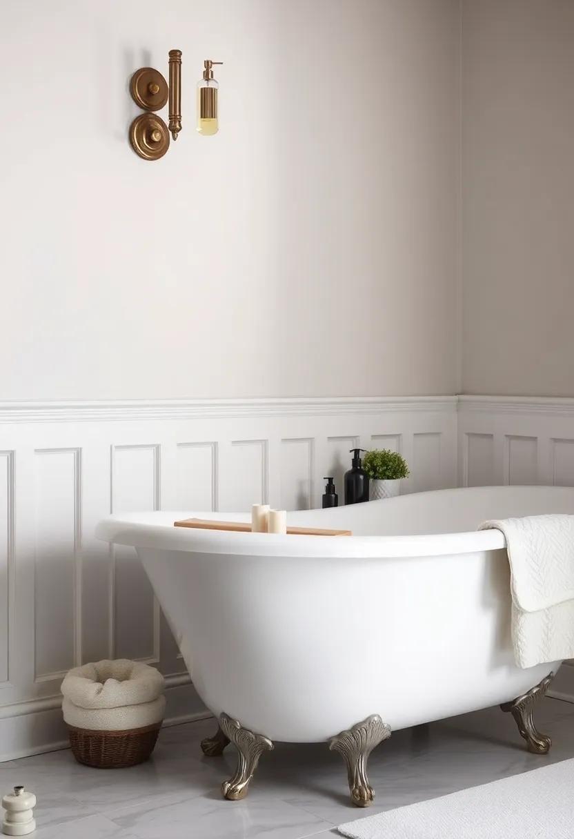 Using a harmonious blend of different metallic elements can create an upscale and inviting atmosphere that feels both timeless and chic. Strategically positioned, these accents will not only spotlight your clawfoot tub but also weave a narrative of style throughout the bathroom.