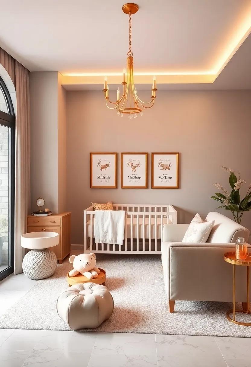 Incorporating family photos into your little one’s nursery can transform the space into a sanctuary filled with love and warmth. Opt for stylish frames that complement the champagne gold theme, adding a touch of elegance while showcasing cherished memories. You might consider creating a gallery wall where each photo tells a story, capturing moments from your family’s journey. Incorporate different frame styles and sizes to create visual interest and keep the design playful, while coordinating colors to harmonize with the overall decor.