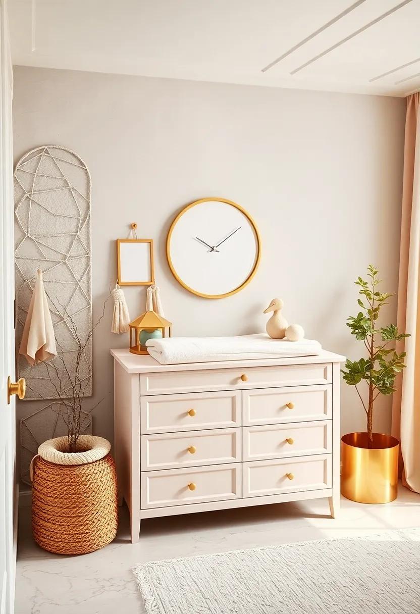 Give your nursery a elegant touch with a chic changing table that not only serves its practical purpose but also enhances the overall aesthetic of the space. Look for designs that incorporate champagne gold accents, as they perfectly complement soft pastels or neutral colors. Options like a compact dresser with a changing pad on top or a stylish console table can seamlessly blend functionality with beauty.