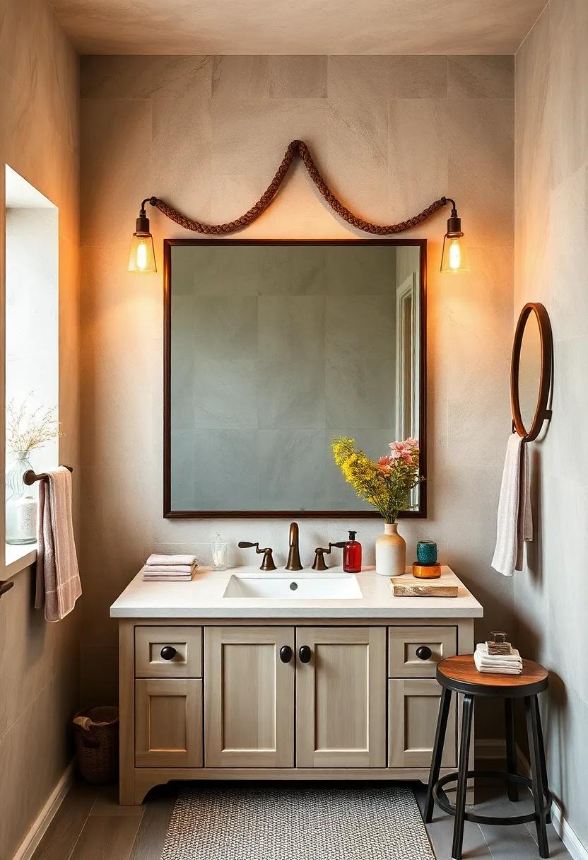 Transform your bathroom vanity into a cozy haven by draping swag lights above the mirror. This artistic touch elevates the overall aesthetic, adding a cascade of soft light that creates an inviting atmosphere. The casual elegance of swag lights complements various decor styles, harmonizing beautifully with farmhouse elements. Consider incorporating materials like twine or delicate chains for a rustic feel, or opt for glass fixtures that shimmer for added sophistication.The gentle illumination can make your morning routines feel more luxurious and relaxed.