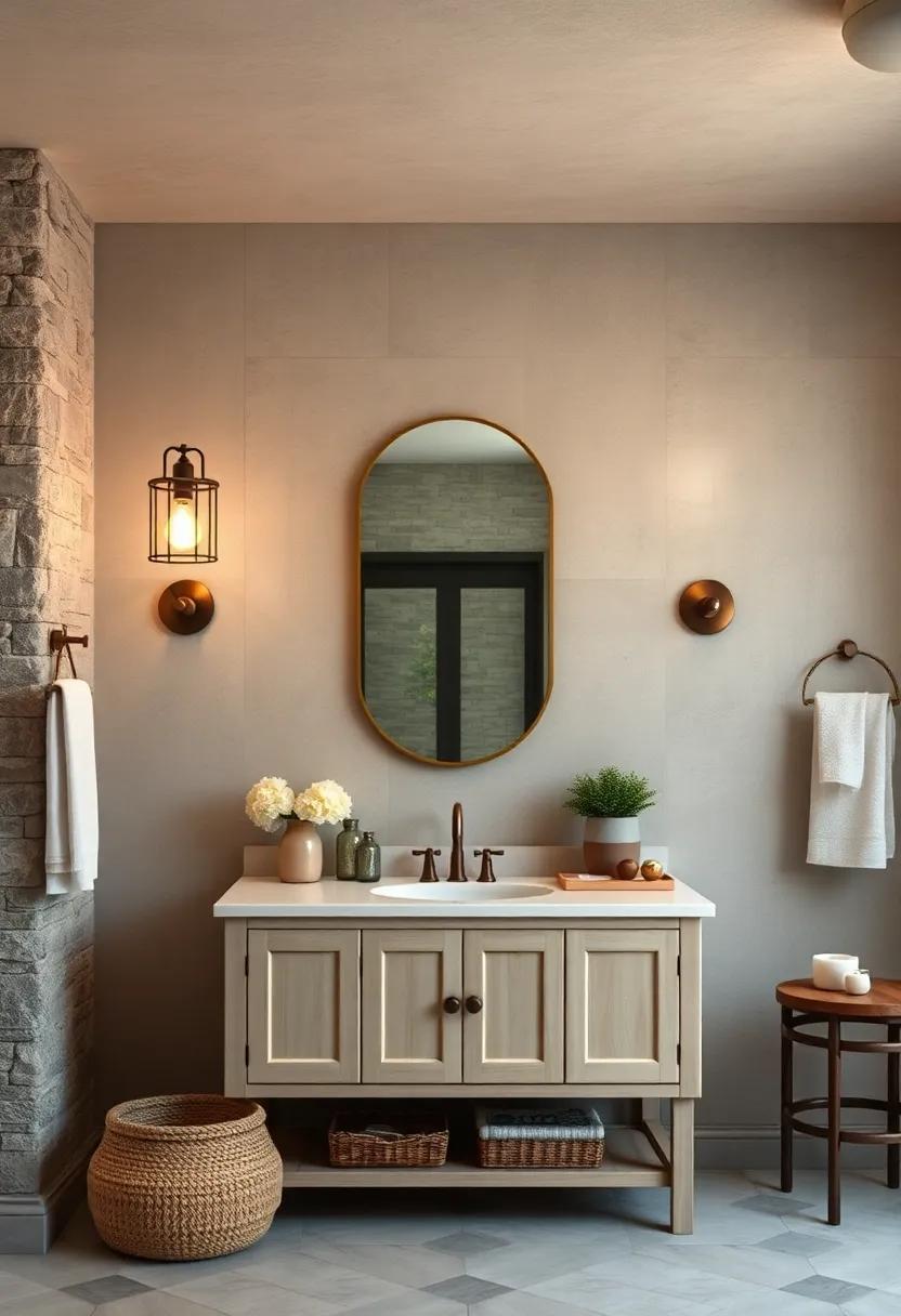Lantern-Style Wall Sconces: Illuminate your bathroom with lantern-inspired sconces that evoke a cozy, outdoor vibe reminiscent of farm life