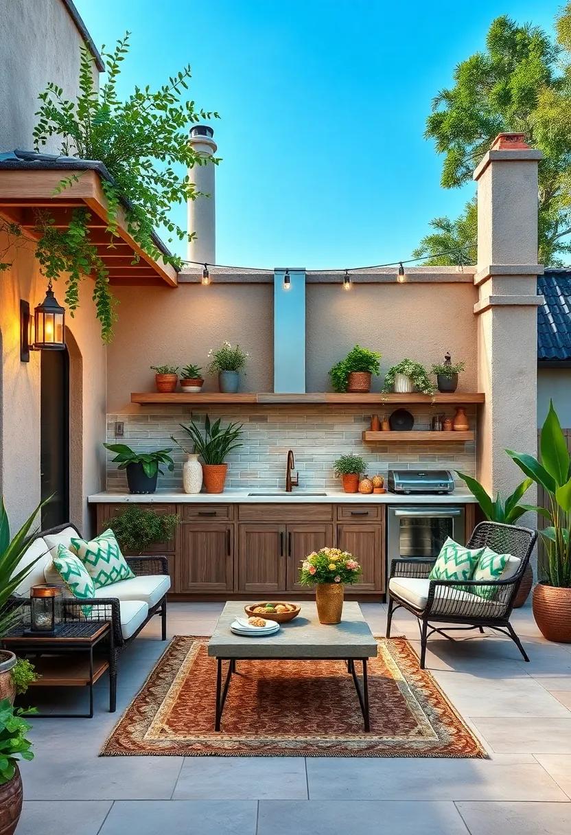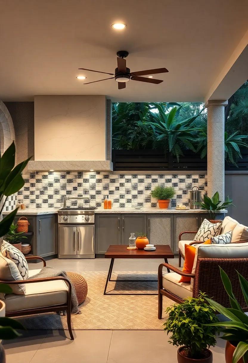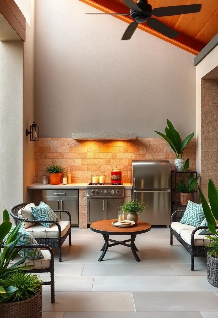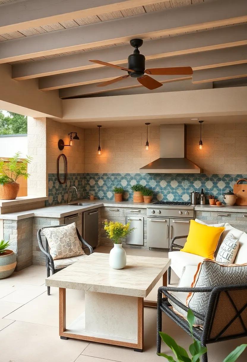 Consider incorporating tiles in different patterns and sizes to create a stunning focal point. A mosaic design can add a playful element, while large-format tiles can offer a contemporary vibe. Pair these beautifully colored tiles with natural materials like wooden cabinetry or stone countertops to further harmonize your patio kitchen with nature. Enhance the tranquil ambiance by introducing plants or natural elements around the dining area, ensuring that your outdoor meals are not just meals but experiences filled with relaxation and inspiration.