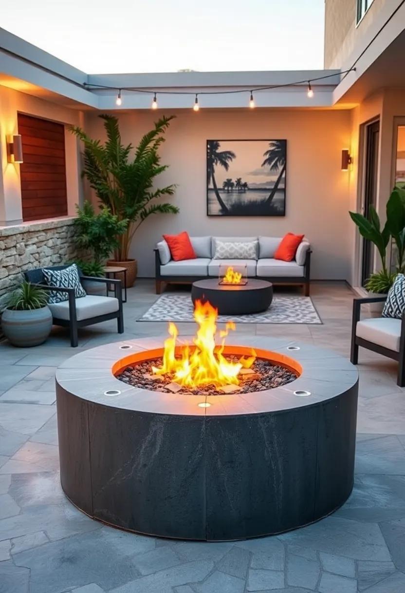 Fire Pit with Embedded Lights: A modern fire pit designed with built-in LED accents around the rim, inviting friends to gather and providing additional illumination after sunset