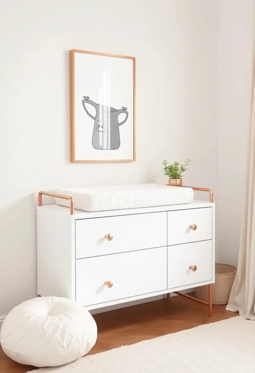 To add a touch of luxury, opt for rose gold accents that enhance the overall decor.Pair the changing table with coordinating rose gold accents, such as lamp stands, picture frames, or wall decor to create a cohesive look. Consider these styles for your statement piece: